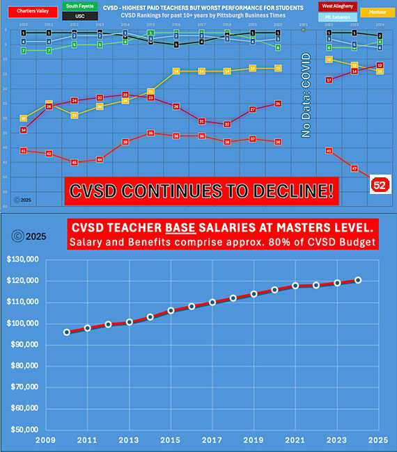 The Pittsburgh Business Times tracks school district rankings. The performance of Chartiers Valley teachers within the classroom has been either flat or declining for the past 10 years, while salaries have soared! Where is the accountability? Taxpayers have been getting fleeced! Chartiers Valley has been at bottom for the past 10+ years however Taxpayers continue to pay Chartiers Valley teachers one of the highest base salaries in Western, PA!